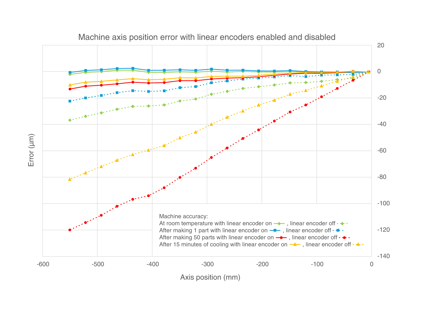 在关闭直线光栅(半闭环)时,随着滚珠丝杠的部分热量消散,误差降至80 µm。然而,在启动直线光栅(全闭环)时,精度提高到约10 µm。
